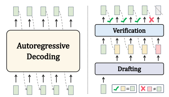 - 然后使用目标模型 \(M_p\) 并行 Verify 这些候选样本及其在 \(M_q\) 中的概率, 并接受所有能使分布与 \(M_p\) 一致的候选;