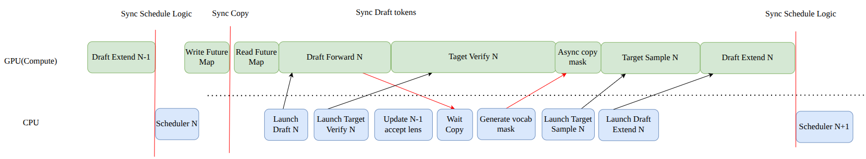 之前的做法是在 Scheduler 的后处理进行 last_batch 的 accept,我们实际上只需要保证 vocab mask 生成前 last_batch accept 即可;同时 target verify 是 GPU 上耗时比较长的任务,我们可以重叠这两个操作,让 GPU overlap CPU 上的计算开销
