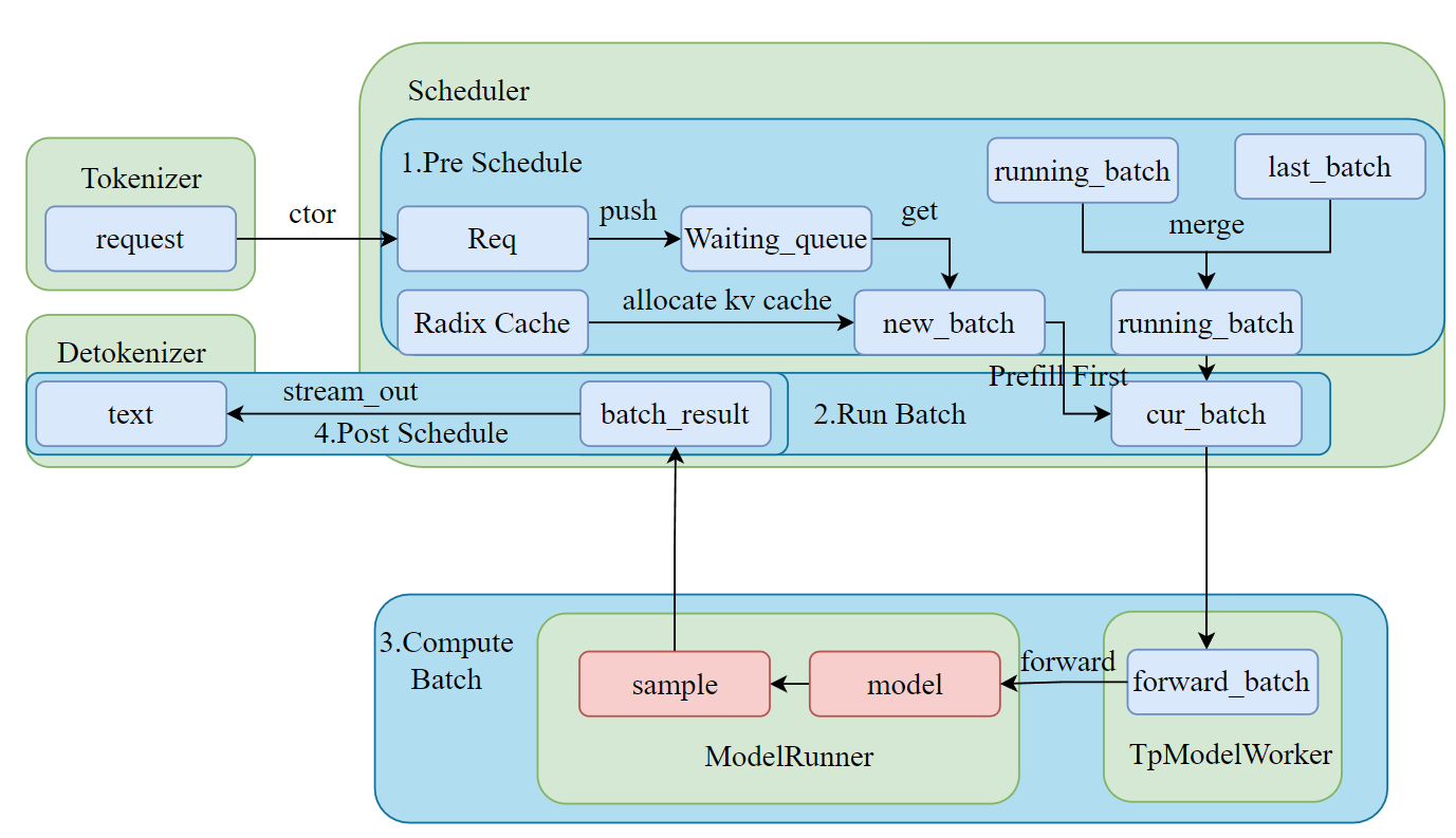 remaining_tokens),可能会被分块成较小的部分。 new_batch中的 Request 将经历 prefill/extend。- prefill/extend 后,
