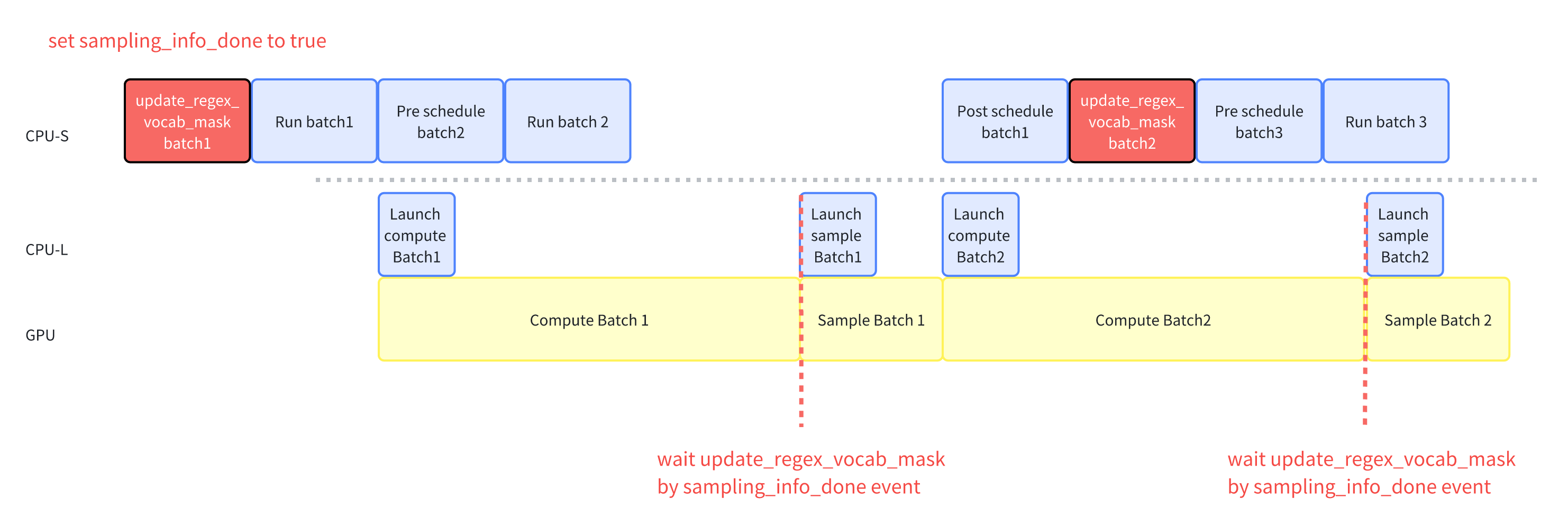 由 CPU 侧调度逻辑保证,先处理 last batch 的 grammar 推进,然后根据 grammar 的状态生成本轮使用的 vocab mask
